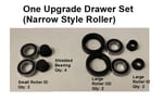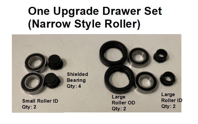 The kit comes with 4 ball bearings, 2 large roller OD adapters, 2 large roller ID adapters, and 2 small roller ID adapters. These combine to make large and small roller assemblies. The large rollers attach to the desk base and the small rollers attach to the drawer. The kit repairs one drawer. The machined adapters easily press onto the bearings and desk axles.