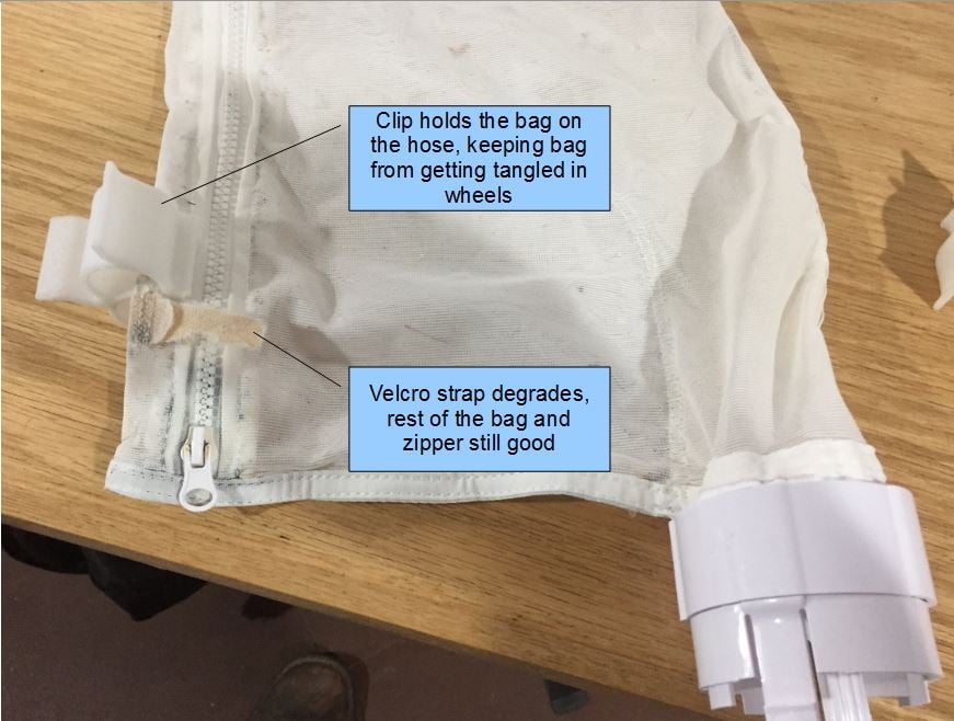 I created this unique polaris bag collar clip design after I had two bags in row with deteriorated velcro attachments break in a couple days and not having any extra bags. The bags are perfectly useful except for the missing velcro strips. Of course the bag needs to be clipped to the hose to keep it from getting tangled up with the wheels.