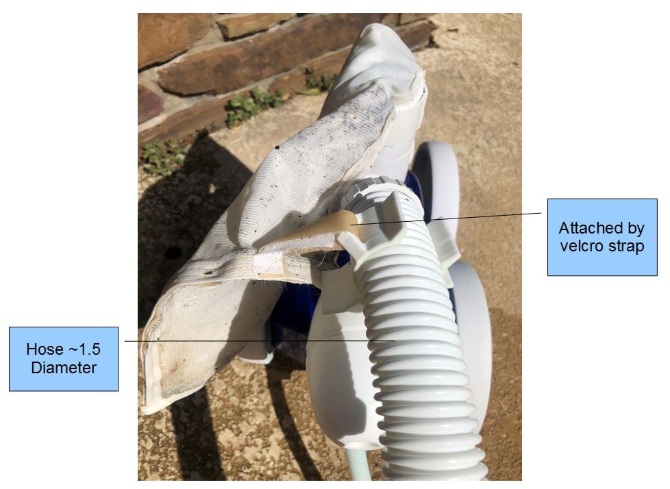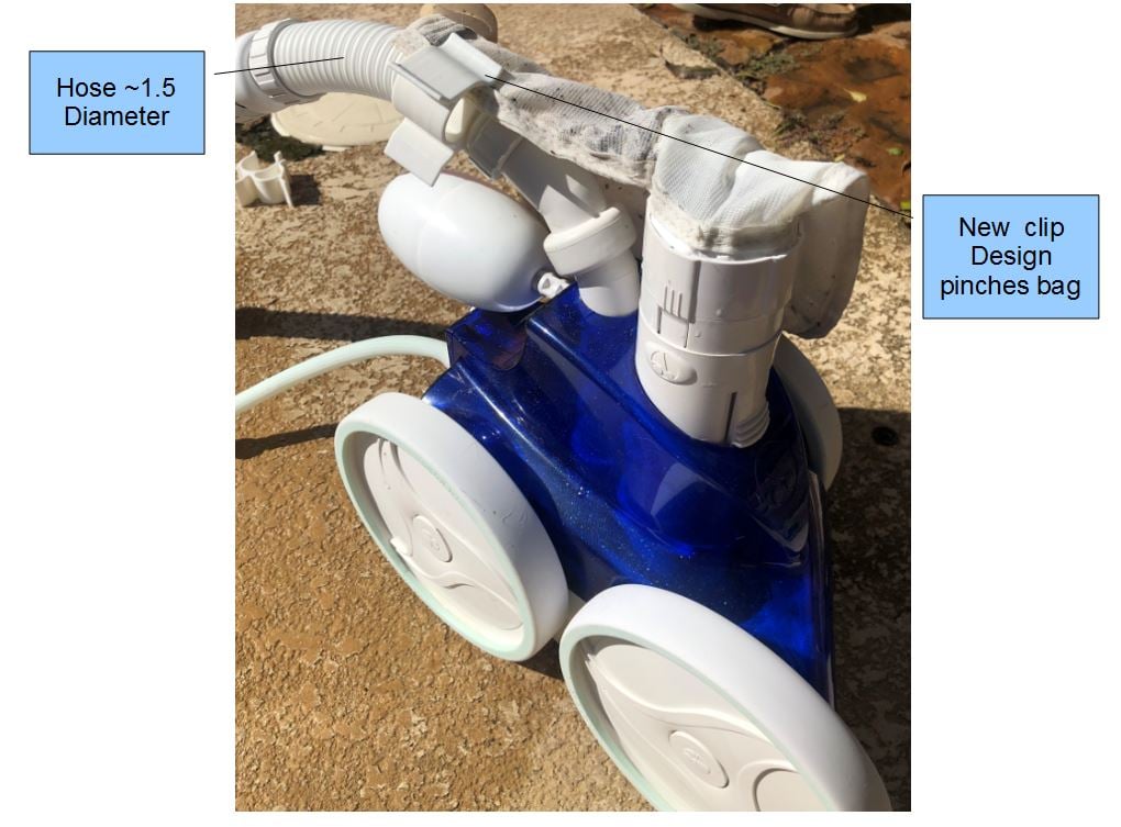 I created this unique polaris bag collar clip design after I had two bags in row with deteriorated velcro attachments break in a couple days and not having any extra bags. The bags are perfectly useful except for the missing velcro strips. Of course the bag needs to be clipped to the hose to keep it from getting tangled up with the wheels.