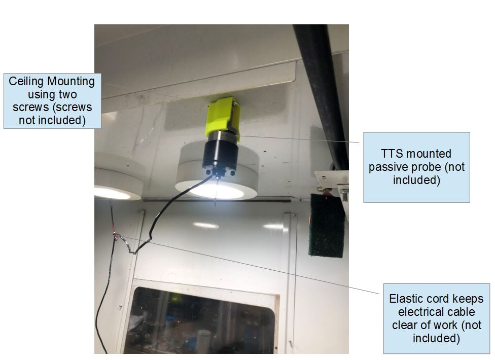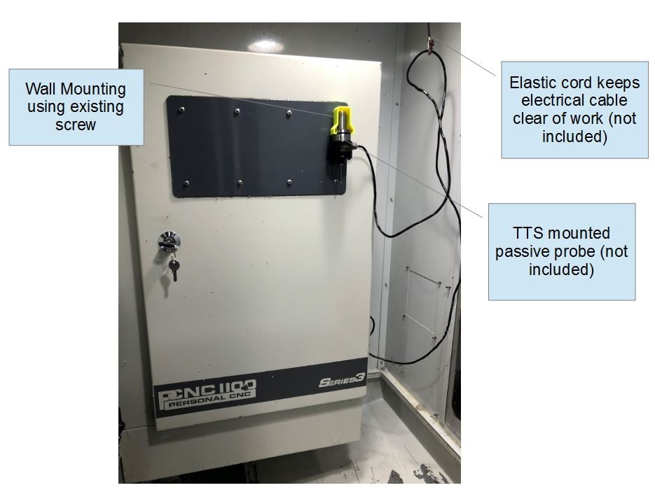 I created this to use with my Tormach PCNC 1100 Series 3. It allows the passive probe to be continually connected and stored out of the way from chips and coolant spray or mist. For me connecting and disconnecting the probe electrically is inconvenient and often messy. This stow clip can either be ceiling or wall mounted.